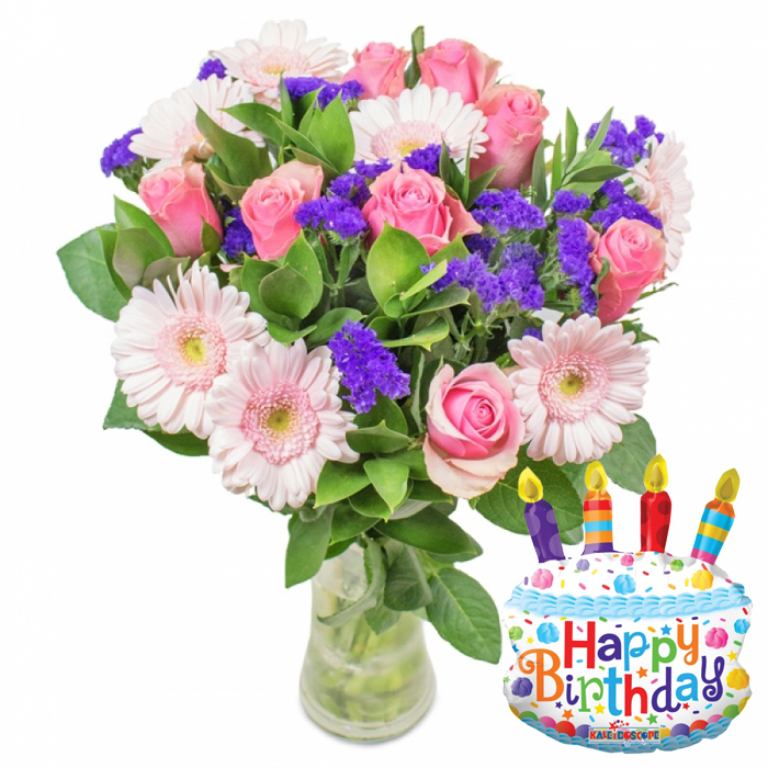 Celebrate their special day with the Pink Daze & Birthday Balloon bouquet from Flower Delivery Chesham. This joyful arrangement features elegant pink roses, vibrant pink germinis, and delicate statice, finished with lush ruscus foliage for a fresh, premium look. Paired with a fun birthday balloon, it's the perfect way to brighten their birthday and make it one to remember.