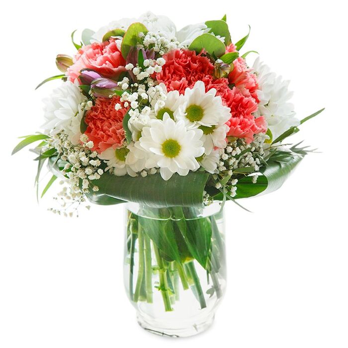 Discover the charm and sophistication of our Charming Petals Arrangement, designed to illuminate any space with vibrant elegance. This stunning bouquet unites the soft purity of white chrysanthemums, the delicate grace of gypsophila, and the tender blush of light pink carnations, beautifully framed by rich aspidistra leaves. Each flower is carefully hand-selected to ensure exceptional freshness, keeping the arrangement lovely for up to 5 days.